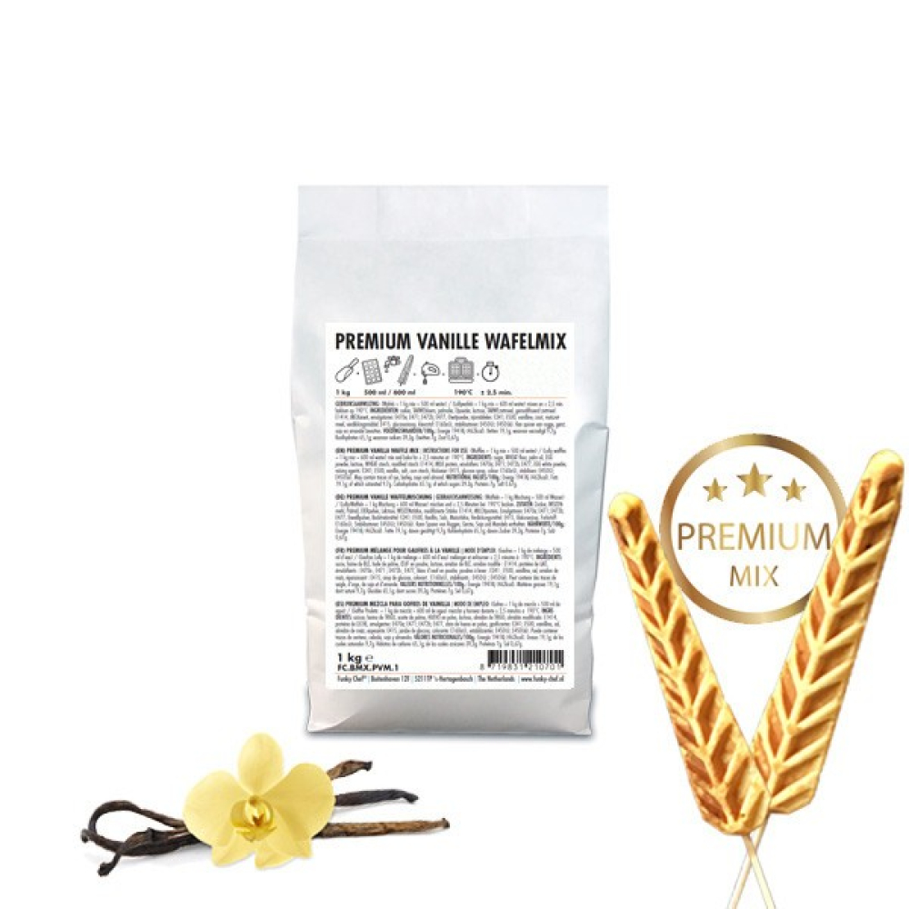 Lollywafels: Mix 1kg mix + 600ml water. Zorg dat het wafelijzer op temperatuur is. leg de stokjes binnen handbereik. Spuit de beide bakplaten in met bakspray en vul de mallen van de onderste bakplaat met beslag d.m.v. een grote knijpfles. Leg direct de stokjes in de uitsparingen van de onderste bakplaat en draai de stokjes een halve slag zodat ze goed in het beslag komen te liggen. Sluit direct het wafelijzer en bak de lollywafels ca. 2,5 minuten goudbruin op 190°C.
