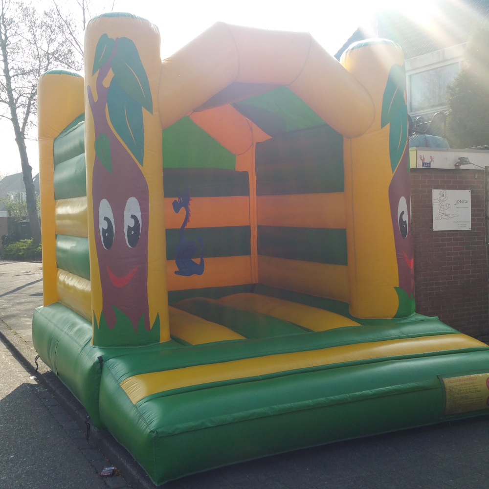 Springkussen met gesloten frame en jungle thema. Door de palmbomen op deze kussens krijgt uw feest een vrolijke zomerse uitstraling.